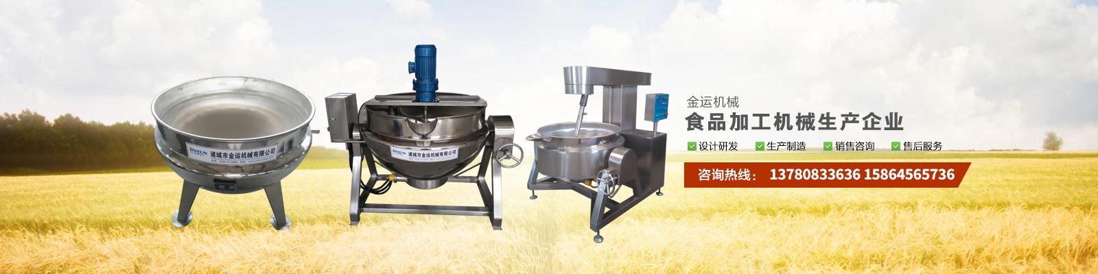 主要產品有:行星攪拌夾層鍋、夾層鍋、壓力煮鍋、各種餡料炒鍋、殺菌鍋(殺菌釜)、巴氏殺菌機、清洗流水線、風干線、真空包裝機、滾揉機、斬拌機、鹽水注射機、大蒜脫皮機、大蒜分瓣機等,廣泛應用于各種食品加工、食品殺菌及農產品深加工、化工、醫藥的生產等。可滿足外資企業、合資企業及國內大中小企業生產需求,產品暢銷全國各地。